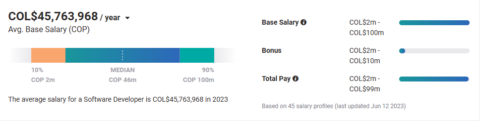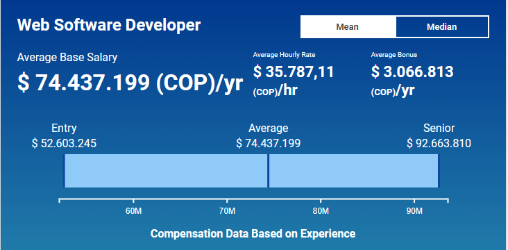 The bonus of a web software developer is another aspect that influences their hourly rate. A bonus is an extra payment that a developer receives on top of their regular salary, usually based on their performance, achievements, or other criteria. According to SalaryExpert, web software developers in Colombia receive an average bonus of around COP 2,170.43 per hour. However, this amount can vary depending on the employer, the project, and the developer. Some developers might receive higher or lower bonuses or none at all. Therefore, you need to consider the bonus as a potential addition to the hourly rate of a developer.