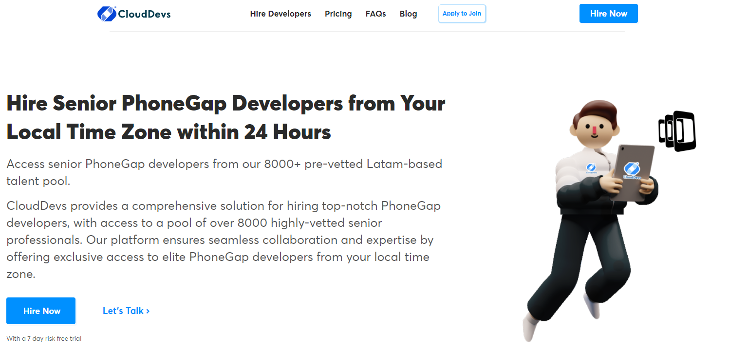 CloudDevs, a leading platform, offers quick hiring of top PhoneGap developers within 24 hours. With transparent pricing ($45 to $70 per hour), it provides a cost-effective solution featuring over 8,000 Elite Senior PhoneGap developers. The process is swift, aligning developers with the client’s time zone for seamless communication. A 7-day trial allows evaluation, with the option to change or receive a refund if unsatisfied. Skilled in cross-platform mobile app development, CloudDevs’ PhoneGap developers boast proven expertise in PhoneGap and related frameworks.
