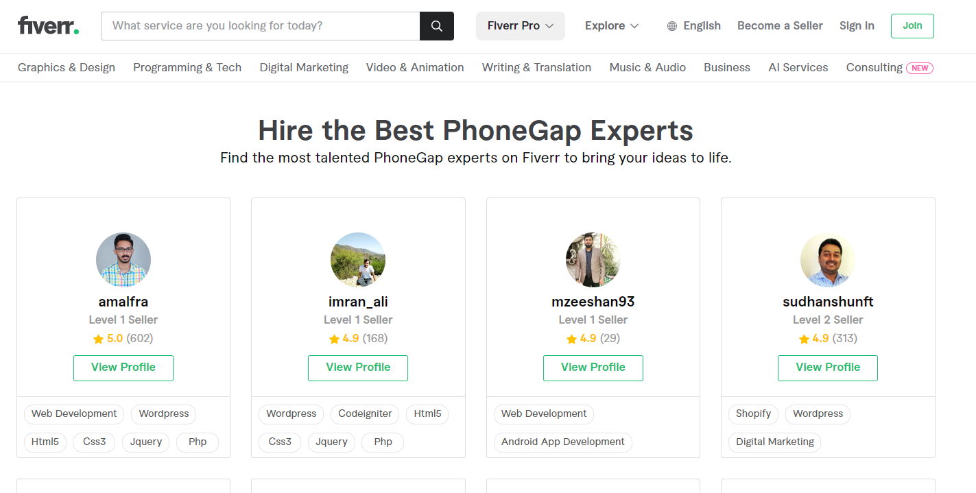 Fiverr, initially known for $5 gigs, is now an affordable platform where freelancers can set their own prices. For new sellers, starting at $5 is recommended. If you are seeking PhoneGap developers, Fiverr offers skilled professionals adept in cross-platform mobile app development with proven expertise in PhoneGap and related frameworks.