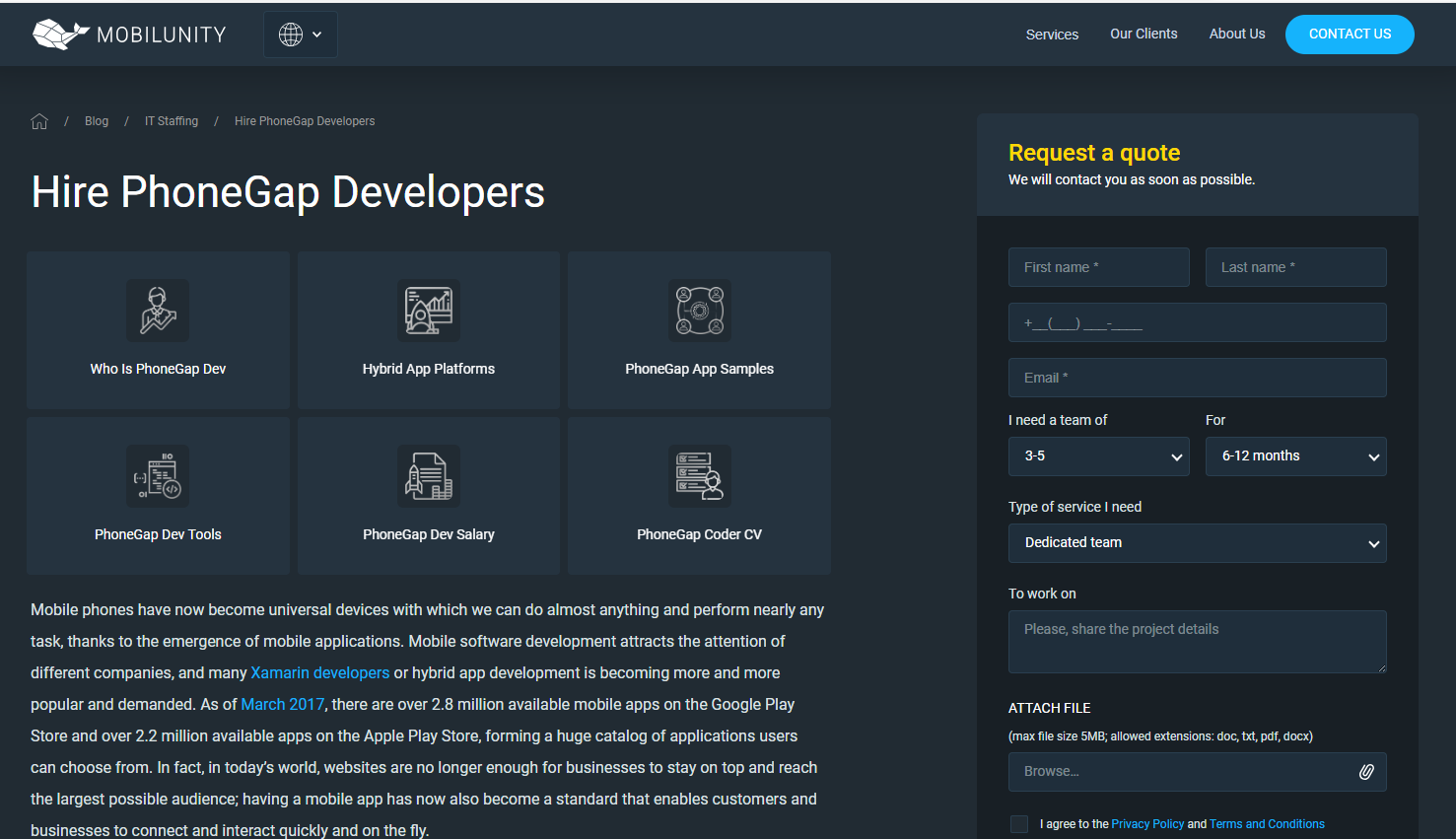 MobilUnity is a company in Ukraine that helps you hire PhoneGap developers. They search and hire the best PhoneGap developers for you. You only need to interview and select them. You can get a good development team quickly and affordably. MobilUnity allows you to manage your projects simply and directly. MobilUnity has PhoneGap developers who can create good and fast web apps in web technologies.