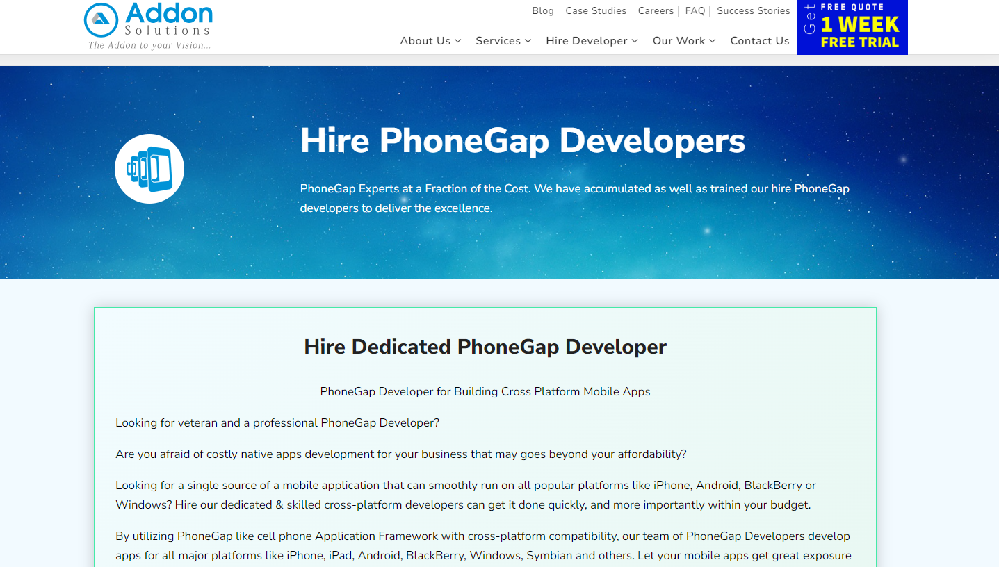 Addon Solutions is a premier mobile app development company offering services for iPhone, Android, and iPad apps, along with mobile UI design. If you need PhoneGap developers, Addon Solutions can assist in hiring skilled professionals proficient in cross-platform mobile app development with expertise in PhoneGap and related frameworks.