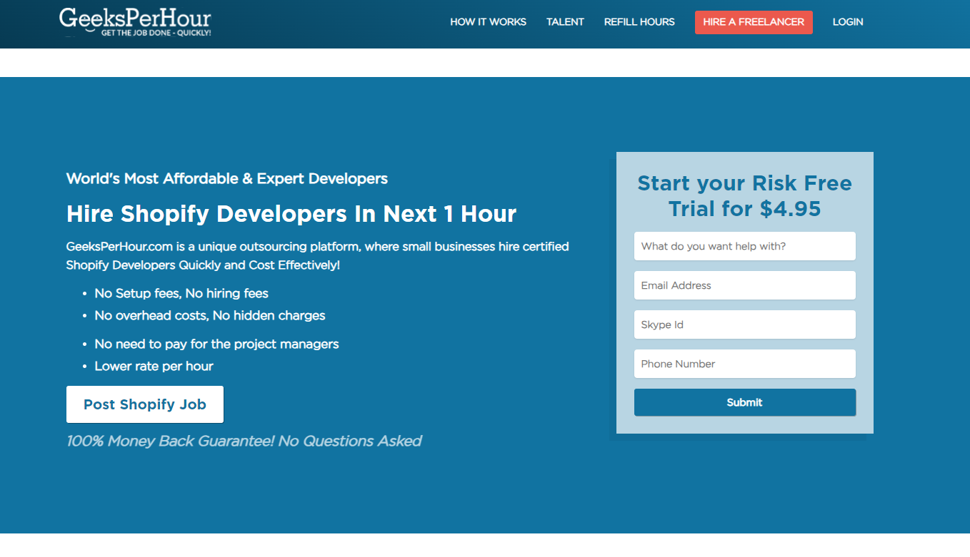 GeeksPerHour, based in the US, specializes in business-centric IT consulting solutions. With a trial package priced under $5, businesses can assess the skills of their freelance developers. Renowned agencies rely on GeeksPerHour for its meticulous screening process that certifies freelance developers, including highly skilled Shopify developers for software projects. In addition to Shopify expertise, they offer developers proficient in WordPress, Python, and more. To hire Shopify developers or other specialists, users can post a request, obtain a trial ticket, select a freelance developer, engage with them, and settle payments based on an affordable hourly rate.