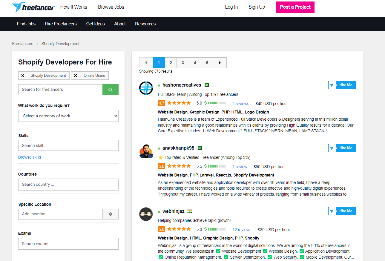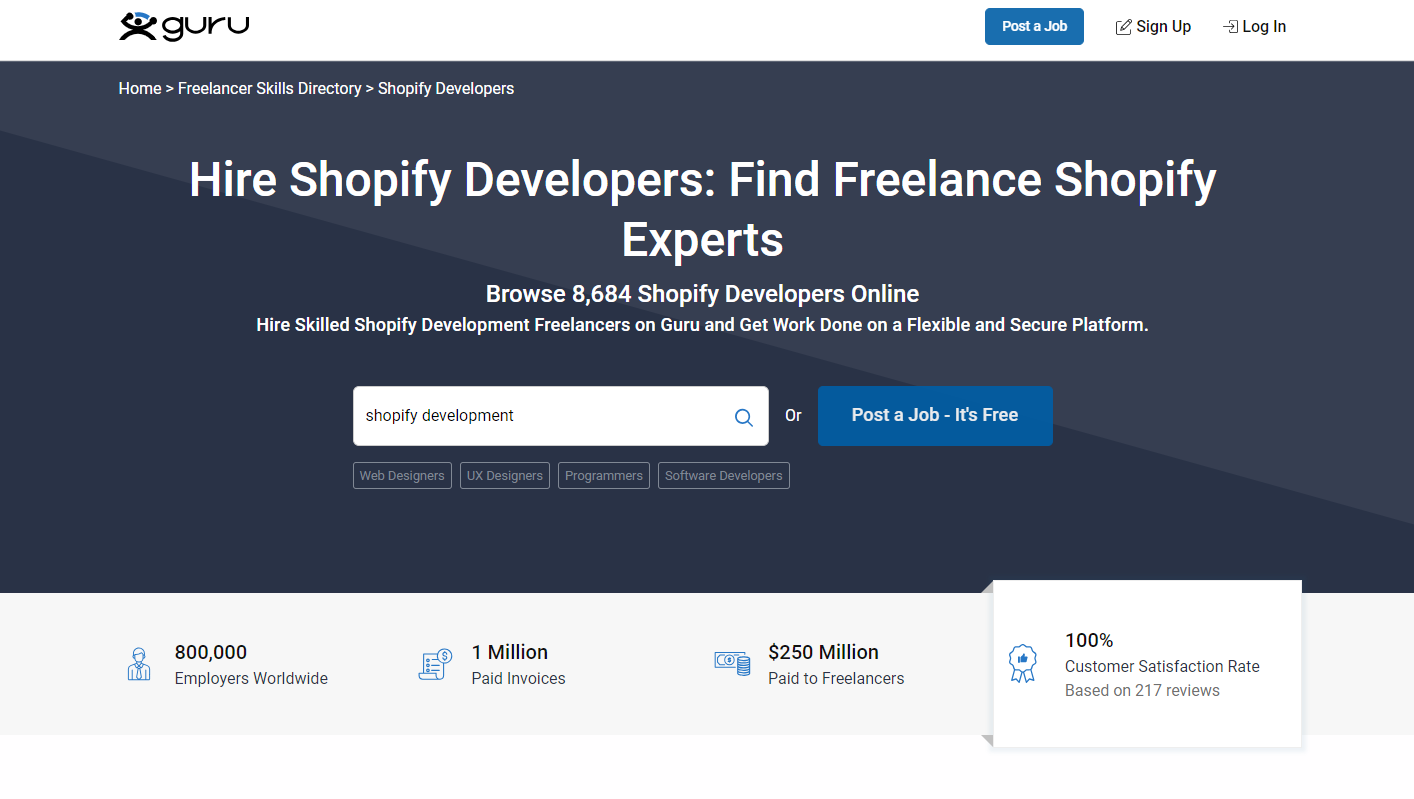 Guru.com stands out as a premier freelancing platform connecting employers with adept freelancers across diverse industries. Offering a secure and user-friendly interface, it provides businesses and individuals a reliable means to hire qualified professionals. With a global talent pool, a straightforward hiring process, secure payment options, and effective collaboration tools, Guru.com is a trusted hub for remote work and freelancing. Employers can easily hire Shopify developers renowned for their skills and expertise, ensuring seamless project execution and quality outcomes.